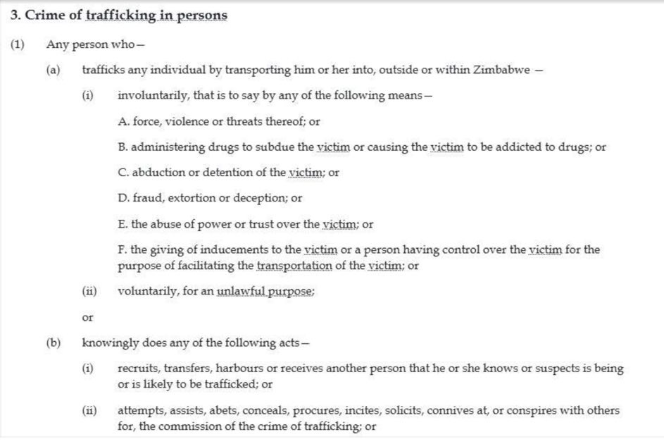 Zimbabwe’s Trafficking in Persons Act defines trafficking beyond the Hollywood-style narratives of abduction and chains. It includes:
