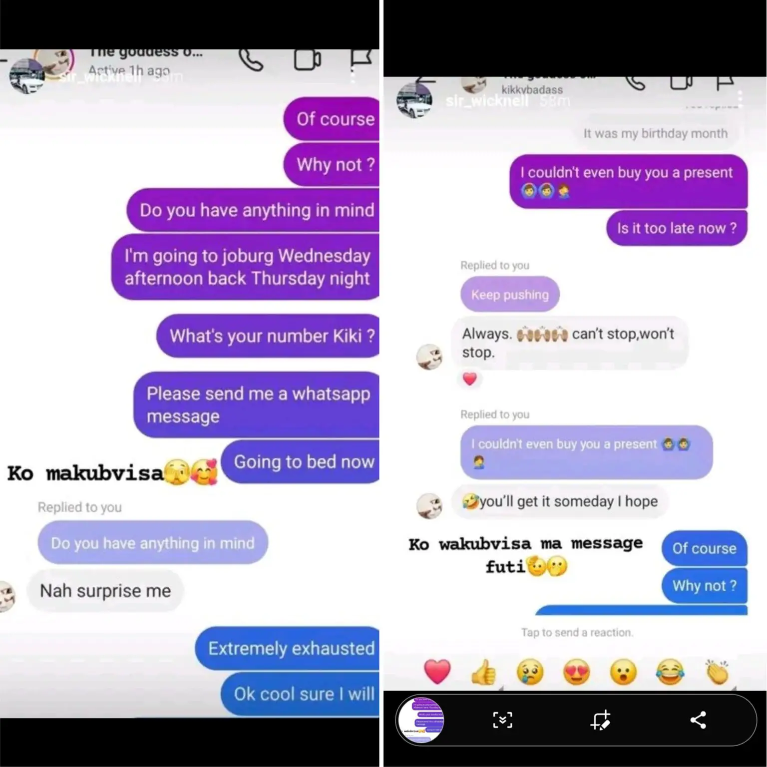In the leaked private chats, Wicknell is believed to have talked with Zimbabwean female rapper Kikky, asking her for her contact details. The businessman asked the lady what she would want as a present. She asked the businessman to surprise her.