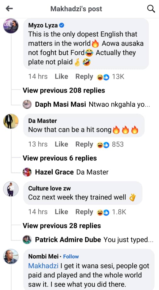 Myzo Lyza, a house music DJ and producer, playfully teased Makhadzi by responding to her post and jokingly commending her English. He remarked, “This is the only dopest English that matters in the world. Aowa ausaka not foght but Ford. Actually they plate not plaid.”