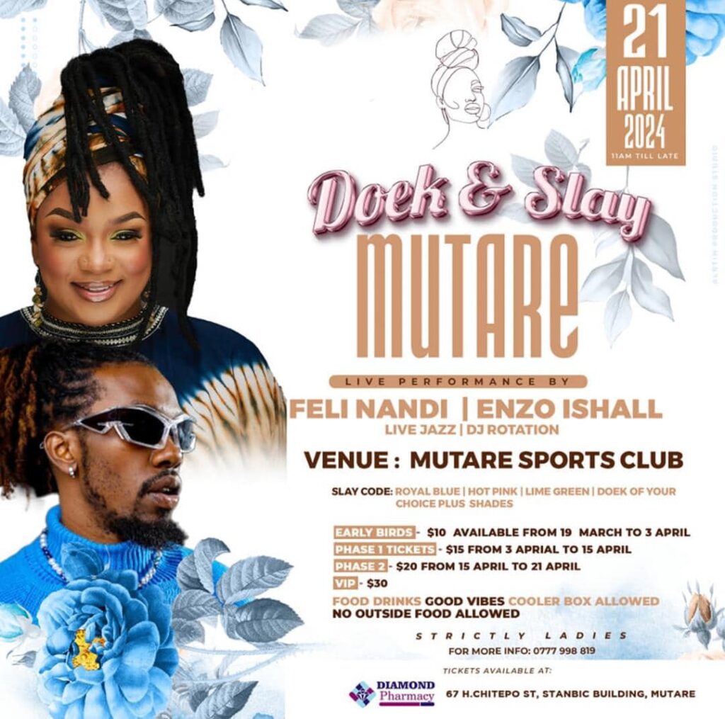 Attention, ladies! Make your way to Mutare Sports Club this Sunday for an electrifying event featuring Dancehall sensation Enzo Ishall and the talented Afro-Fusion songbird Feli Nandi and her band. The performance promises to be a captivating experience from 11 am until late. General admission is $20, while VIP tickets are available for $30. Don’t let this special event pass you by!