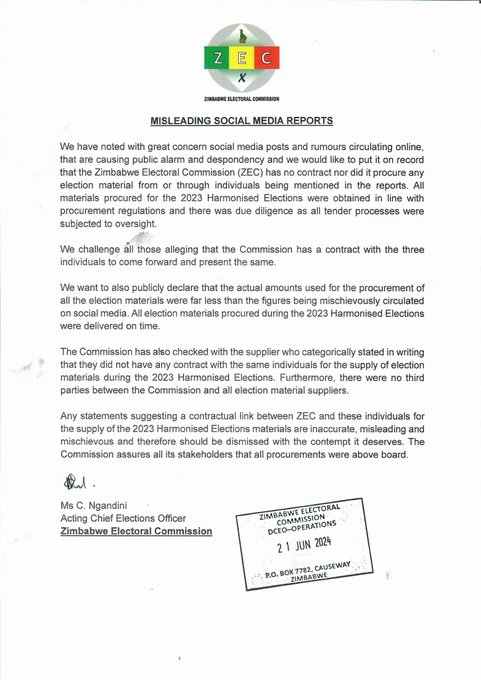 “Any statement suggesting a contractual link between ZEC and these individuals for the supply of the 2023 Harmonised Elections materials is inaccurate, misleading and mischievous and therefore should be dismissed with the contempt it deserves.